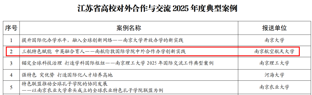 4月1日,江苏省高等教育学会涉外办学研究委员会公布了江苏省高校对外合作与交流2025年度典型案例,南航伦敦国际学院凭借“三航特色赋能 中英融合育人”的中外合作办学创新实践成功入选。这一荣誉,既是对学院初创之年办学成效的肯定与鼓励,也是对学校持续深化教育对外开放、稳步拓宽国际化育人路径的高度认可。